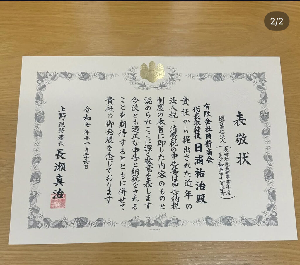 上野税務署長様より優良申告法人の表敬を頂きました! 2025年11月27日 最終更新日時 : 2025年11月27日 88genki88 伊賀地域の税務署である上野税務署の署長様より「優良申告法人」の表敬を頂きました! とても名誉なことだと社員一同喜んでいます。 下の写真は頂いた表敬状と、表敬状を受け取る社長です。